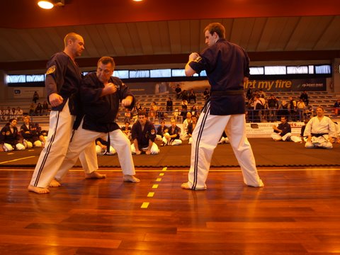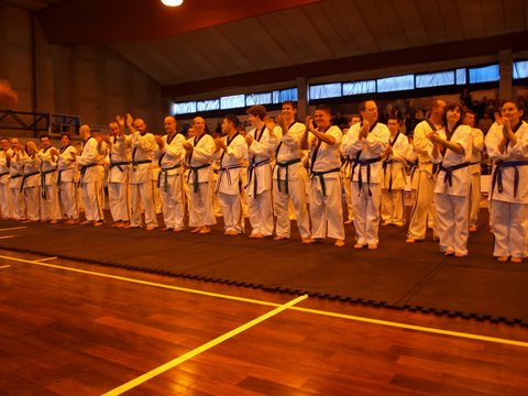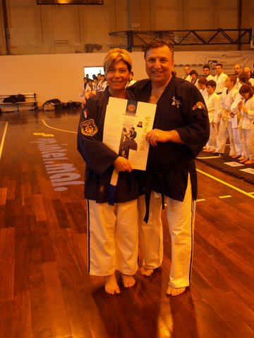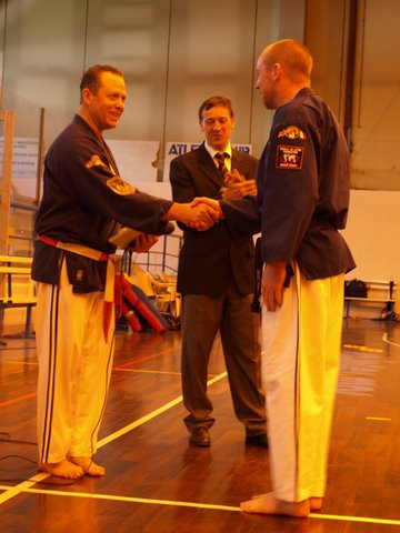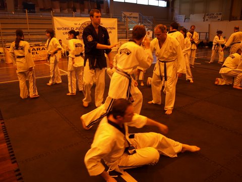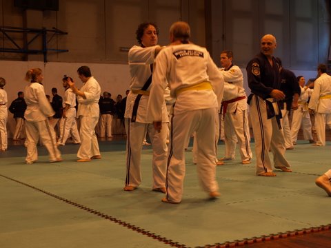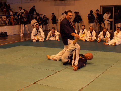 Nel pomeriggio dalle 14.00 in poi si sono svolti gli esami di Dan e di Gold Tab. Tutti i candidati erano molto emozionati per la presenza di tale Commissione e soprattutto del Soke Robert Clark. Nonostante ciò ogni allievo è riuscito a dare il meglio di sé con grande impegno ed entusiasmo, spronati come sempre dai Maestri che trasmettevano loro ancor più energia. Gli esami sono terminati alle 19.00 con i complimenti del Soke Clark, molto felice nel vedere una preparazione tecnica che rispecchia esattamente la sua Scuola ed una mentalità volta al rispetto verso i propri Maestri. Dopo le fatiche degli esami tutti al ristorante Aries: cena a base di pesce, accompagnato dal buon vino dei Colli di Carrara.