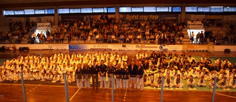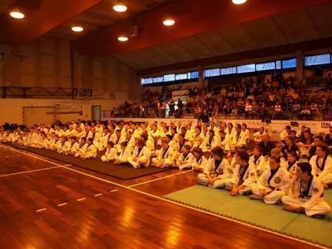 Alle 12.00 l’arrivo dei bambini… una moltitudine: circa 250, che con un sottofondo musicale da brivido sono entrati per il saluto correndo in fila, coordinati dalle Maestre Catia Freschi 4°dan e Patrizia Cassoli 4°dan, due colonne portanti del Team Mancini. Tanta è stata la soddisfazione dei genitori e del pubblico sulle gradinate.