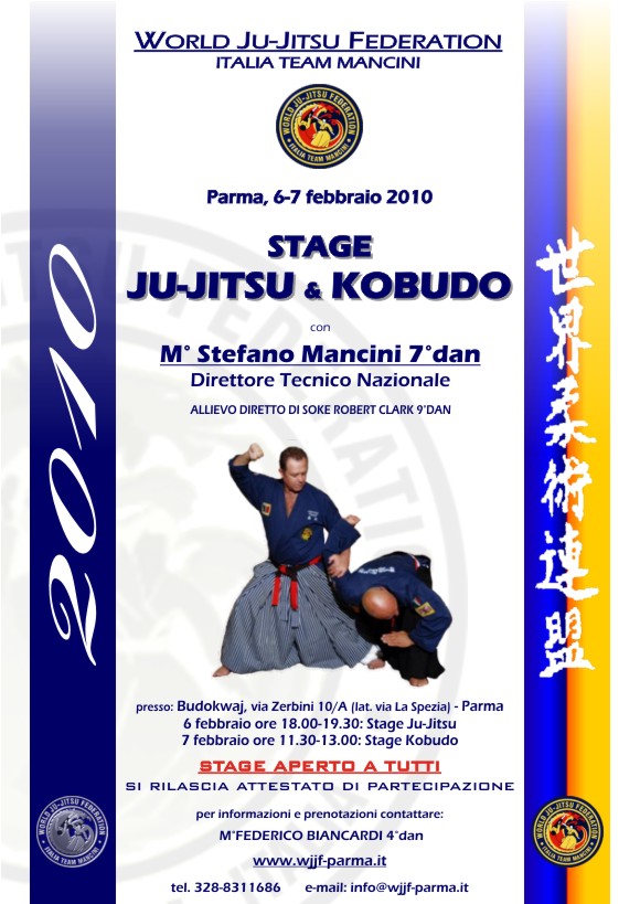 La sessione di esami e stage del 6/7 febbraio si è svolta come sempre sotto la direzione del D.T.Nazionale M°Stefano Mancini 7°dan. L'intera sessione ha coinvolto sul tatami circa 70 allievi di Ju-Jitsu e 30 di Kobudo provenienti dai dojo affiliati WJJF Team Mancini di Parma e di Cremona. Molto gradita è stata la presenza di allievi venuti da Pisa,Livorno e Milano, che hanno partecipato agli allenamenti del weekend, contribuendo ad instaurare un clima sano e positivo di cooperazione ed amicizia. Un ringraziamento a tutti loro e ai Maestri Claudio Rigacci e Patrizia Cassoli, ed anche al M°Fabrizio Lazzarin che, presente tante altre volte, è stato impossibilitato all'ultimo momento. Questa sessione ha visto la promozione di ben 4 nuovi Istruttori 3°livello: Guido Manfredi, Jazi Abdessattar, Alessandro Frati e Pier-Paolo Mammi.